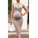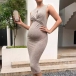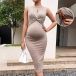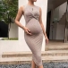 This maternity dress is designed with comfort and style in mind. The key features include a round neck, sleeveless silhouette, ribbed fabric, and ruching at the front. The ribbed fabric provides a soft, stretchy texture that gently hugs the body, accommodating the changing shape during pregnancy.