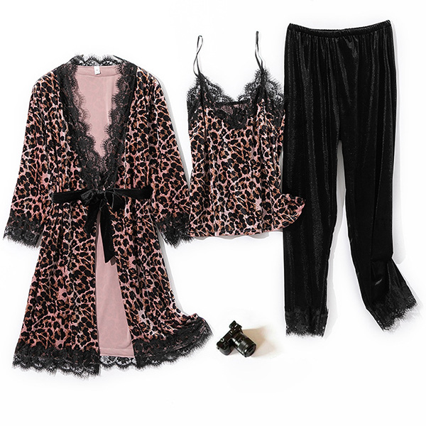 This set is designed to make your lounging time luxurious and fashionable. The leopard print adds a touch of wildness and excitement, while the lace spliced detailing adds a feminine and delicate touch. Crafted with velvet fabric, these pajamas offer a soft and cozy feel against your skin. The set includes a top, pants, and a matching robe, allowing you to mix and match according to your preference.