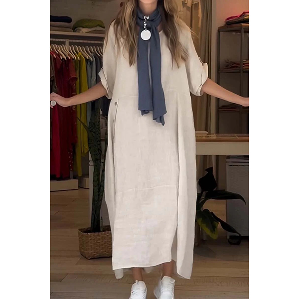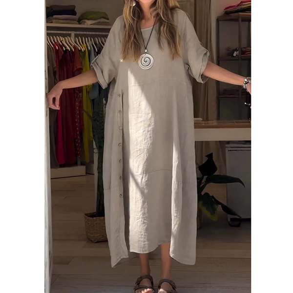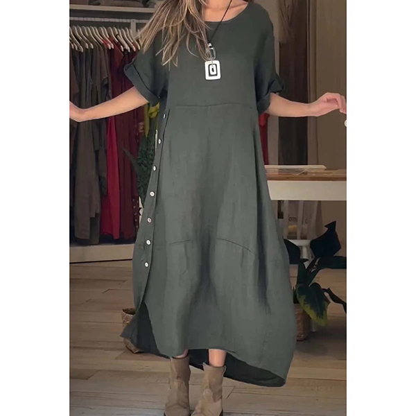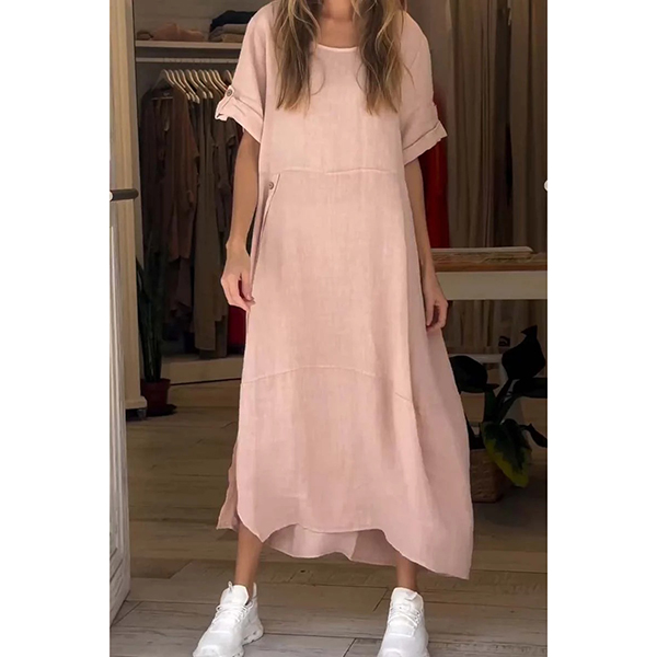 Comfy Solid Color Crew Neck Short Sleeve Loose Cotton and Linen Dress