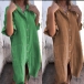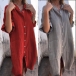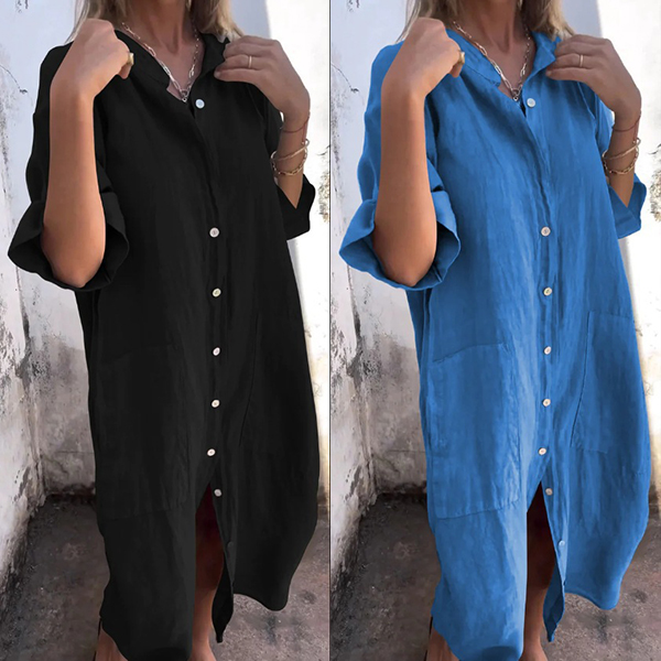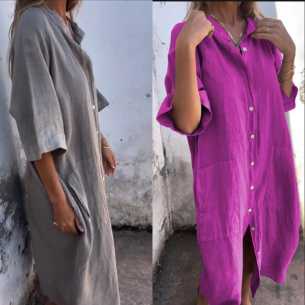 Comfy Solid Color Elbow Sleeve Front Button Cotton and Linen Dress