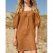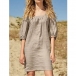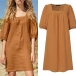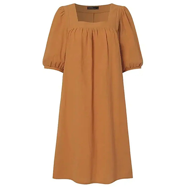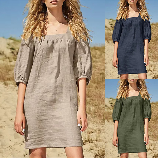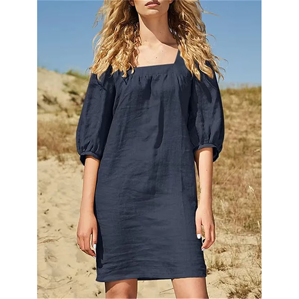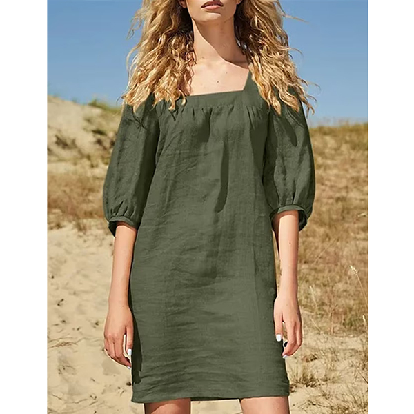 Comfy Solid Color Square Neck Elbow Sleeve Loose Cotton and Linen Dress