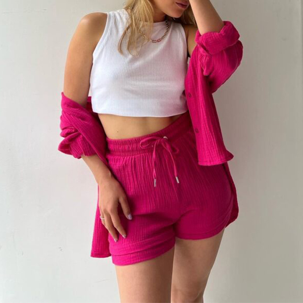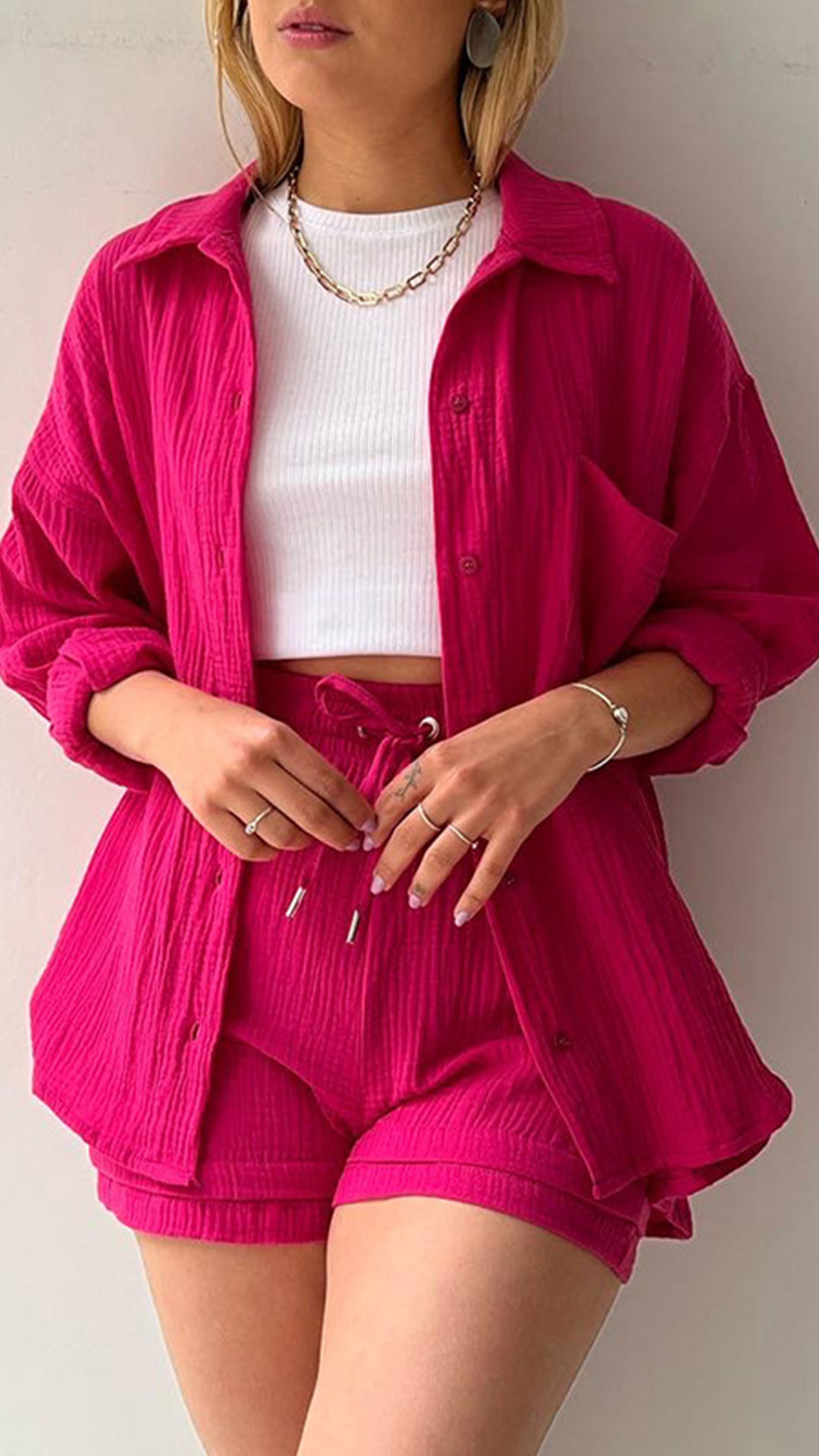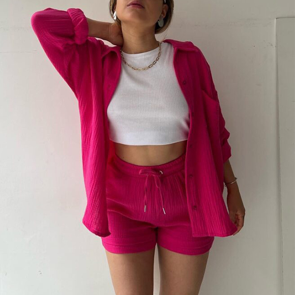 This comfortable two-piece set features a cozy long sleeve cardigan and relaxed drawstring shorts in a solid color for a versatile, laid-back look. Multi-colors avabile.