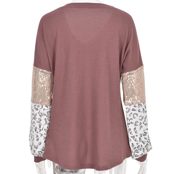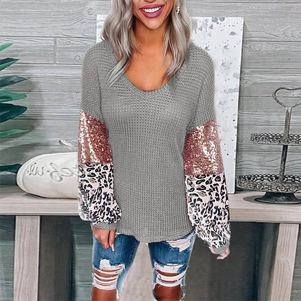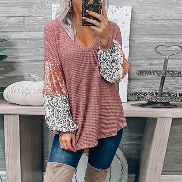 Contrast Color Leopard Sequin Printed V-neck Long Sleeve Top