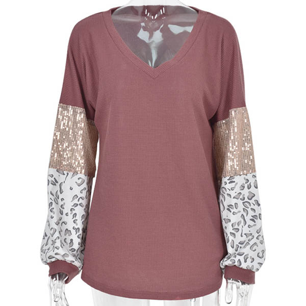 Sequin is a very popular style this year, which can make you look more stylish. What's more, combined with leopard printed and contrast color and V-neck design, this piece can enhance your fashion sense. Please open your wardrobe to welcome this wonderful top!