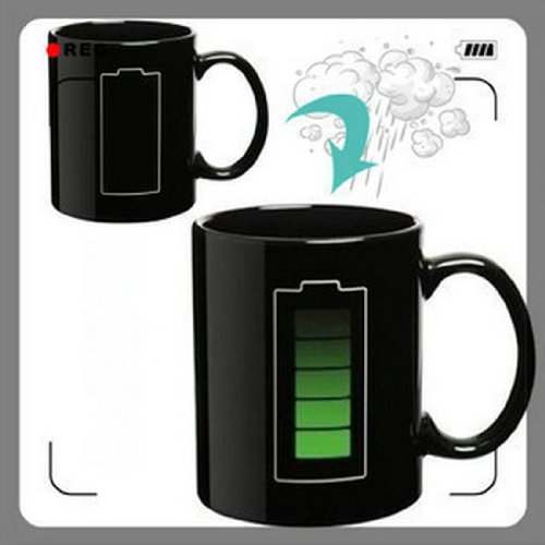 Do your batteries need recharging? Then perhaps it's time to put your feet up with a hot cuppa in one of these great colour changing battery mugs! This seemingly plain mug lights up when hot water is added to reveal the image of a charged battery. Porcelain Mug in natural battery electricity grid Microwave safe Heat sensitive New design, novelty, funny Attractive gift box