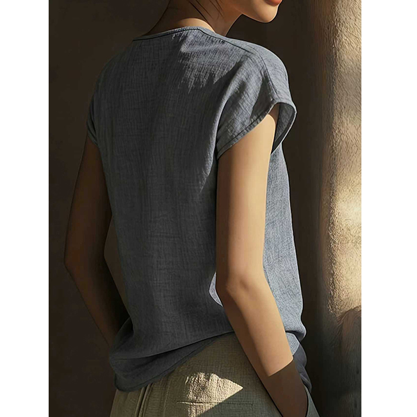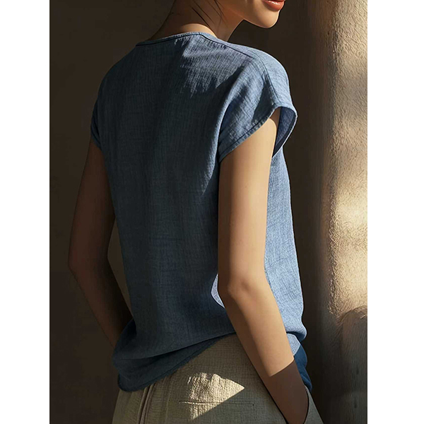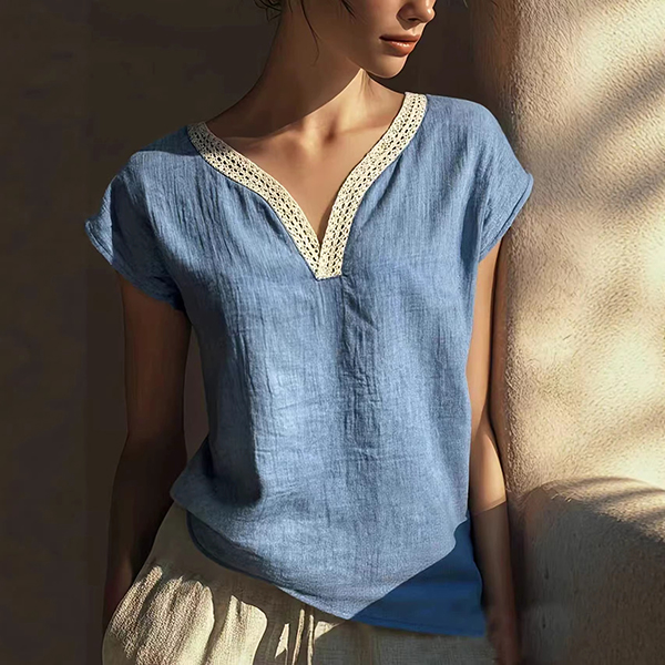 Embrace a touch of rustic elegance with this beautifully textured V-neck top. Crafted from a breathable cotton-linen blend fabric, this blouse features a unique "slub" texture that gives it an authentic, vintage feel. The standout feature is the delicate cream crochet lace splicing along the V-neckline, adding a romantic, cottagecore aesthetic to a casual staple. With its relaxed fit and breezy cap sleeves, it's the perfect choice for effortless summer style.