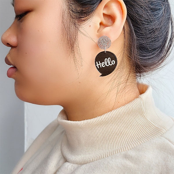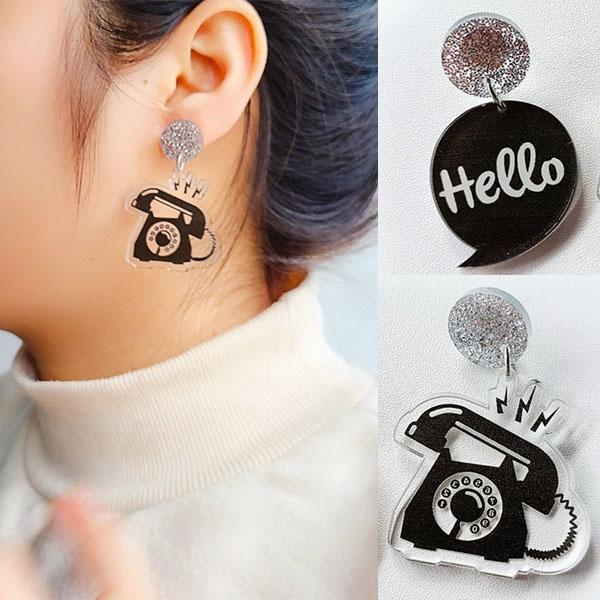 You are sure catch more eyes when you dress yourself up with this pair of asymmetric earring. The telephone and "Hello" shaped pendant make these pieces look so distinctive and chic. It can easily be the highlight of your overall look.