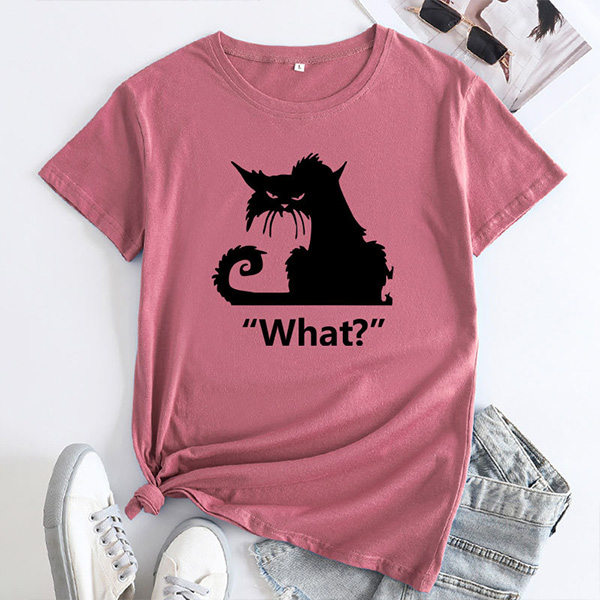 Crew Neck Short-Sleeved T-Shirt with Angry Cat Print