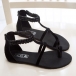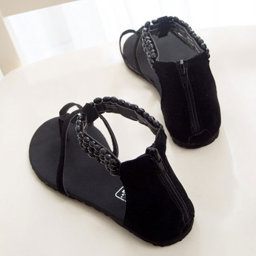 This pair of Roman style sandal features a solid black colorway,front cross straps and a beaded ankle strap,a rear zip up closure and skidproof rubber sole.Wear it with denim cutoffs or dress.