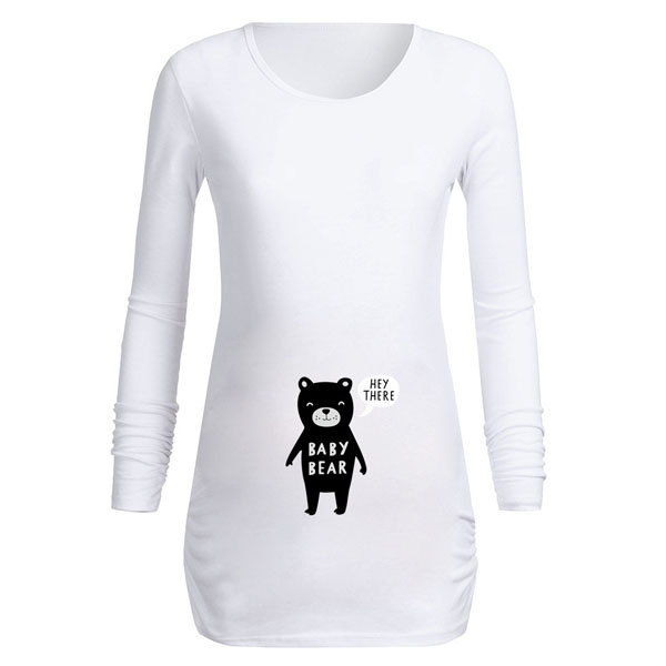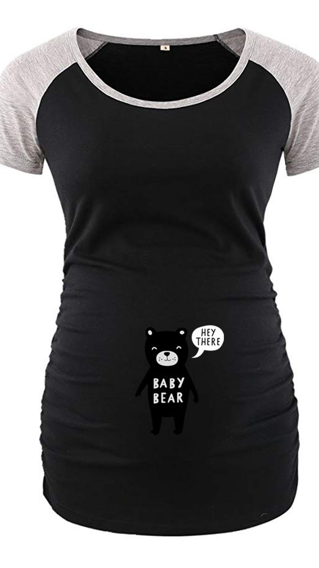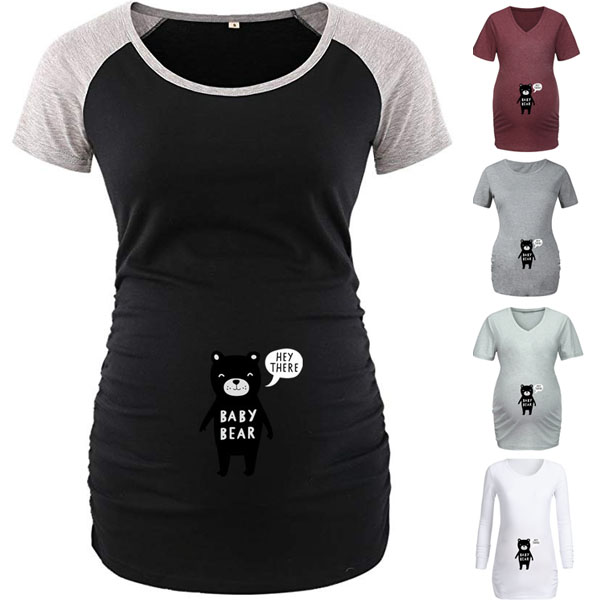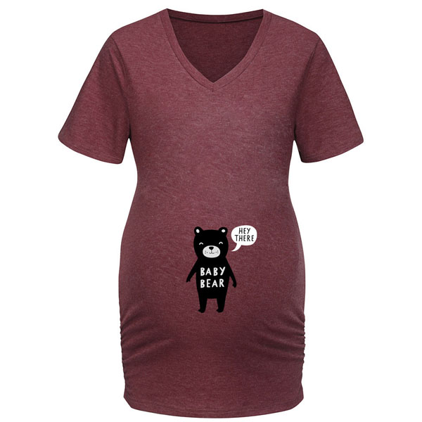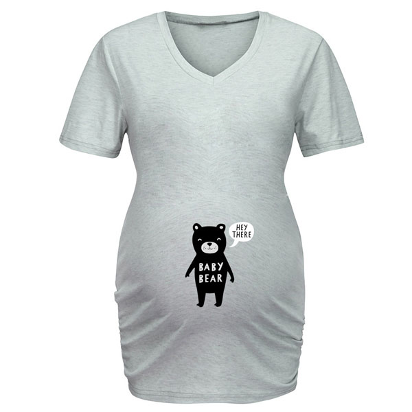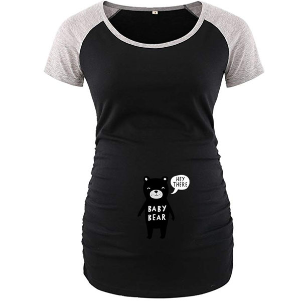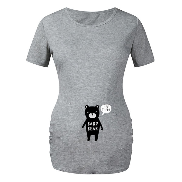This t-shirt is designed with bear pattern,which can lend you a dash of lively and playful vibes. Crafted from soft and breathable fabric,with short sleeve and round neck design,which can ensure an utmost comfort. For the pregnant woman,this cozy yet stylish t-shirt is their good choice in these hot summer days.