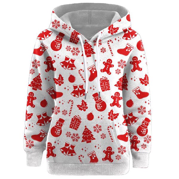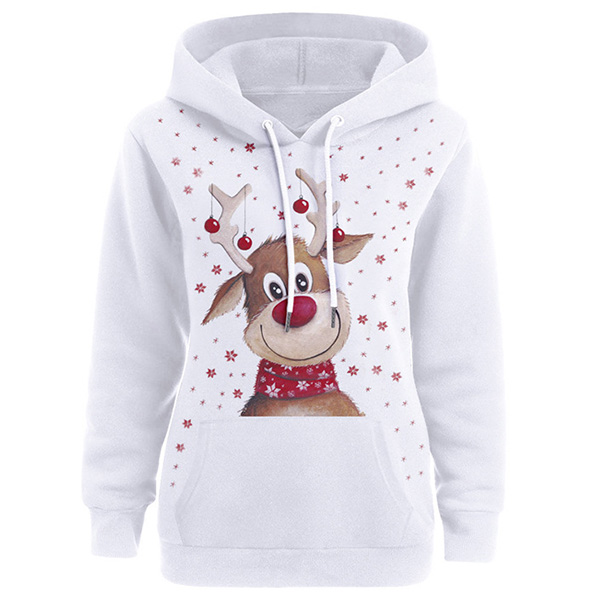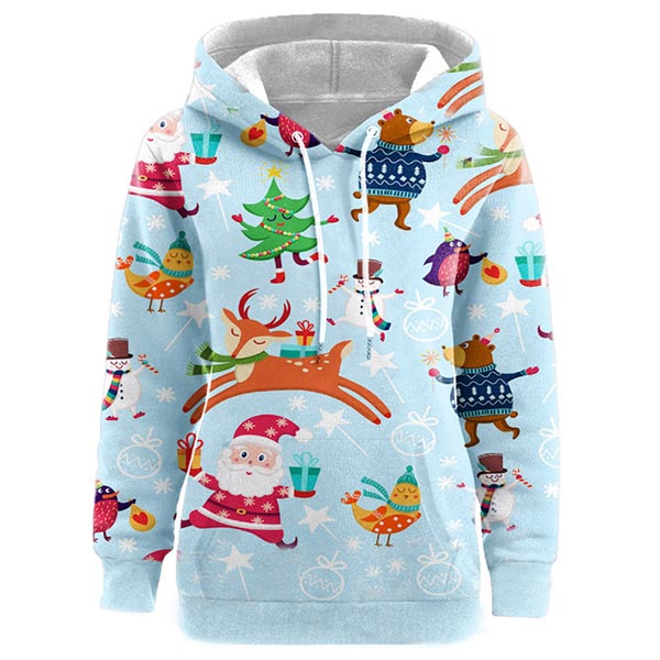 Showcase your cute and playful side through this sweatshirt. Its cartoon printed pattern design makes this piece look so lively,while the long sleeve,hooded silhouette and front kangaroo pocket design maintain the classic design style. For the coming Christmas Day,this piece would easily strike your mind.