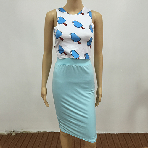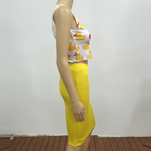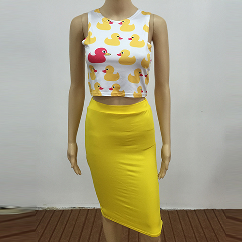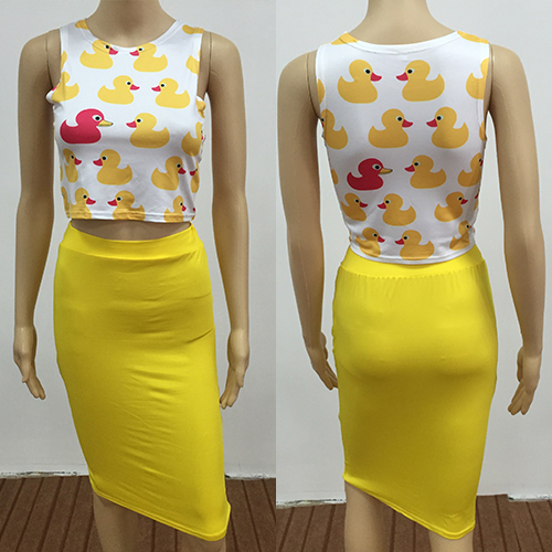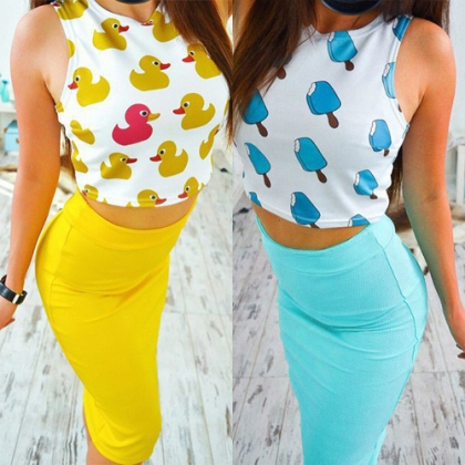 Don't know how to match? Then this two-piece set would be your best choice. Including a cartoon printed sleeveless round neck crop tops