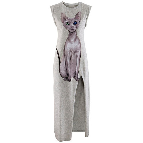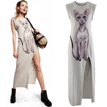 This dress looks so chic and cute. Features a cute cat pattern,with sleeveless,round neck and side slit hem