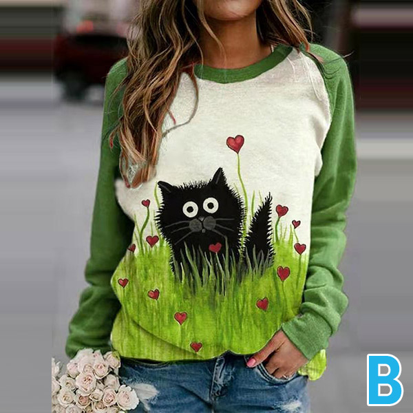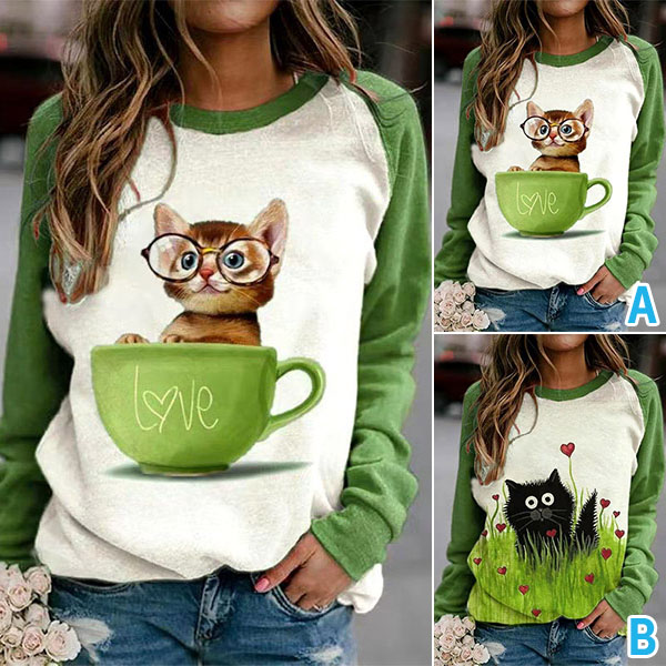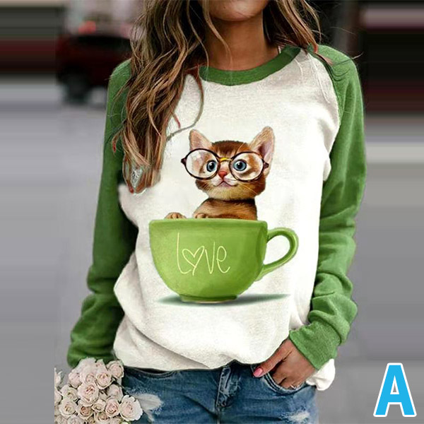 Cute Cat Printed Long Sleeve Round Neck Contrast Color T-shirt