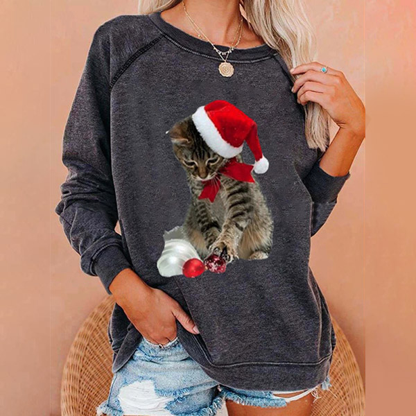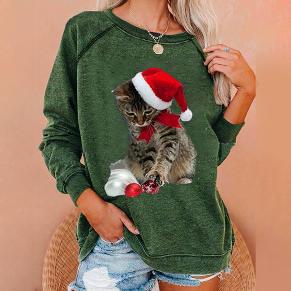 Cute Cat Printed Long Sleeve Round Neck Loose Sweatshirt