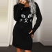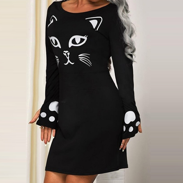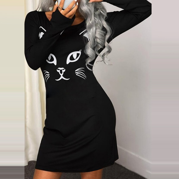 Cute Cat Printed Long Sleeve Round Neck T-shirt Dress