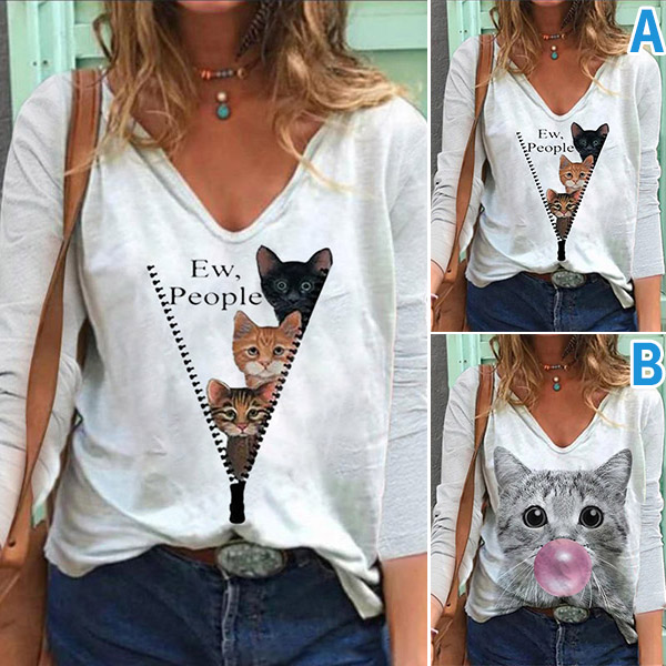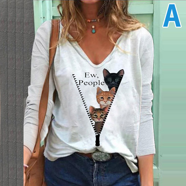 Add a dash of lively and playful vibes to your wardrobe with this t-shirt. It is decorated with cat printed pattern,finished with long sleeve,v-neck and a loose silhouette,this piece is sure to offer you a comfortable day. It is just the thing you need on your casual days.