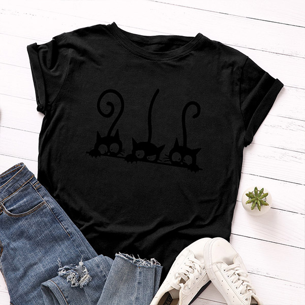 A cotton shirt featuring front cat print design, a round neck, short sleeves.