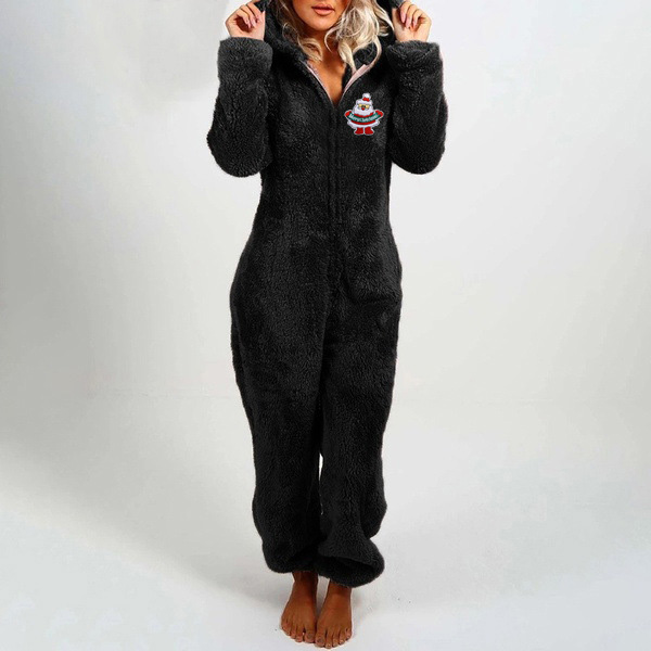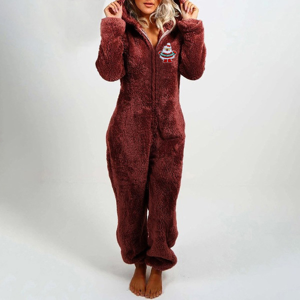 Cute Christmas Pattern Long Sleeve Hooded Plush Jumpsuit One-piece Pajamas