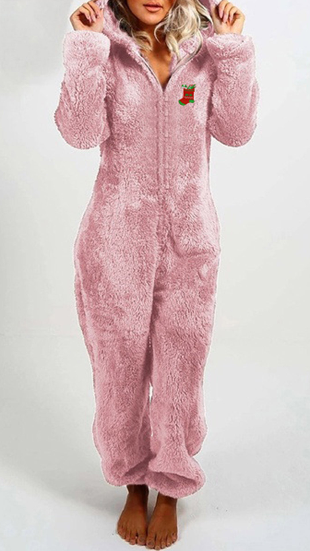 For your Christmas Eve,this One-piece Pajamas can easily strike your mind. Its soft,breathable plush fabric and hooded silhouette design can keep the comfy and warmth. And the Christmas embroidery pattern design will add some festival atmosphere. A good gift for the coming Christmas Day!