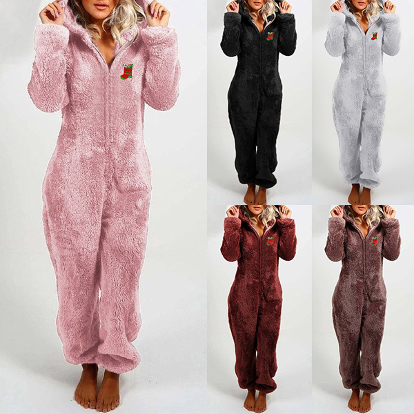 Cute Christmas Pattern Long Sleeve Hooded Plush Jumpsuit One-piece Pajamas