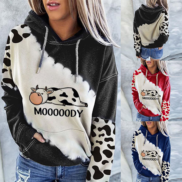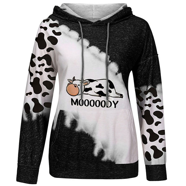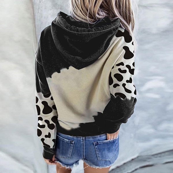 Wanna a lively,relaxed yet stylish sweatshirt? Then make your eyes focused on this sweatshirt. The cow printed pattern design makes this piece look so playful and unique,while the long sleeve and hooded silhouette design maintain the classic design style. It is your perfect choice in these autumn days.