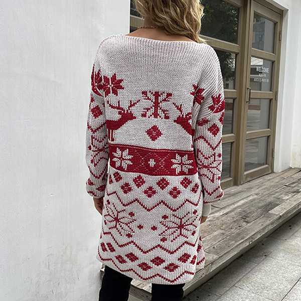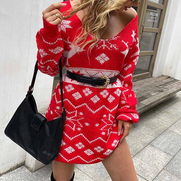 If you are looking for a proper outfit for the coming Christmas Day? Then just have a look at this sweater dress. The elk pattern design not only adds the lively vibes,but also makes it more matching with the festival atmosphere. Finished with long sleeve,v-neck and slit hem,this sweater dress can give you a happy and wonderful Christmas time.