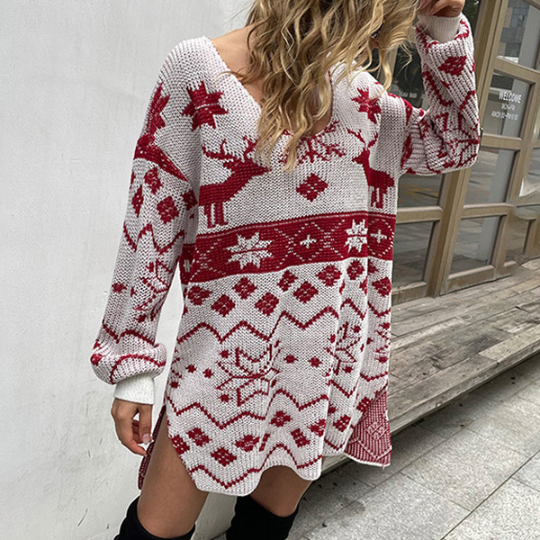 Cute Elk Pattern Long Sleeve V-neck Slit Hem Christmas Sweater Dress