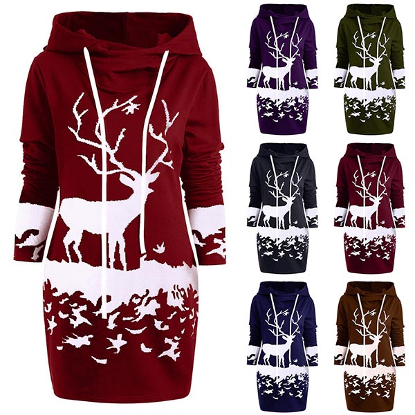 Keep your look cozy and stylish with this sweatshirt dress. It is finished with long sleeve,hooded and a fit silhouette,this dress knows how to portray your slender figure,and the elk printed pattern design will lend you a dash of lively and playful vibes. Dress it up with your favourite shoes for a stylish and charming autumn look.