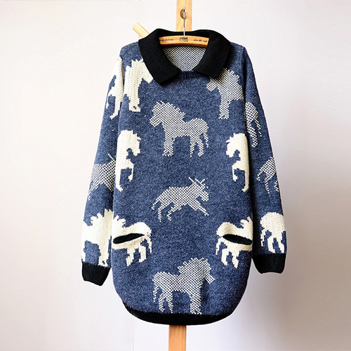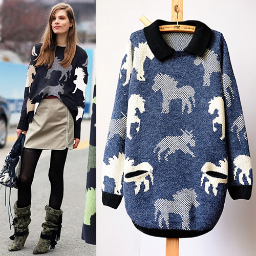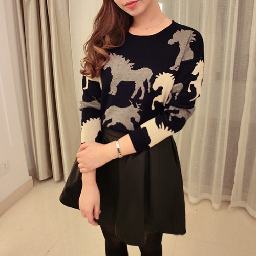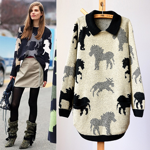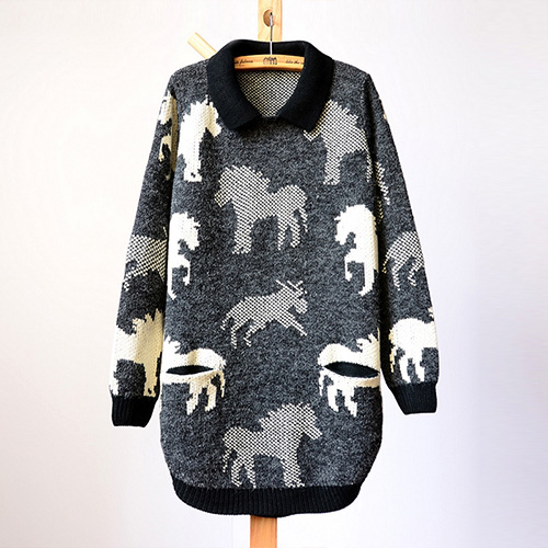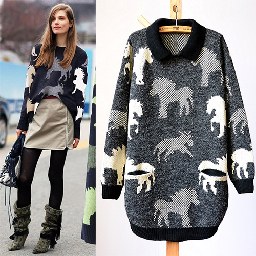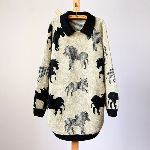 Cute Horse Pattern Long Sleeve Long-style Knitted Pullover Sweater