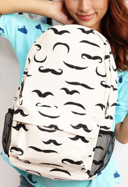 Bearing this mustache print backpack and walking in the road, passerby will keep looking at you. This backpack is featured the mustache print. It looks cute and lovely. The mustache print and the bag forms the mxing color effect, that make it eye-catching.