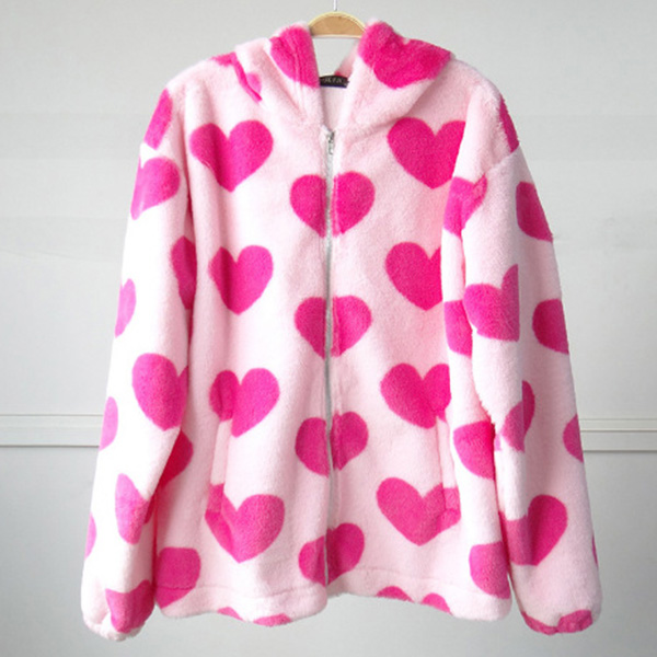 Cute Plush Heart Printed Hooded Zipper Jacket
