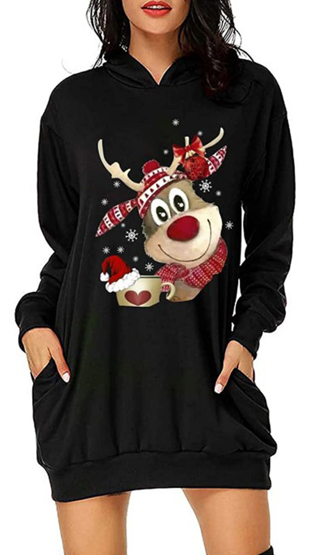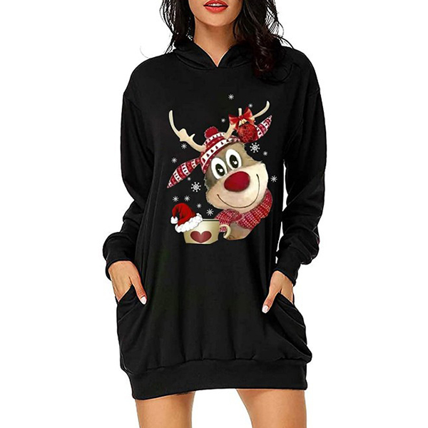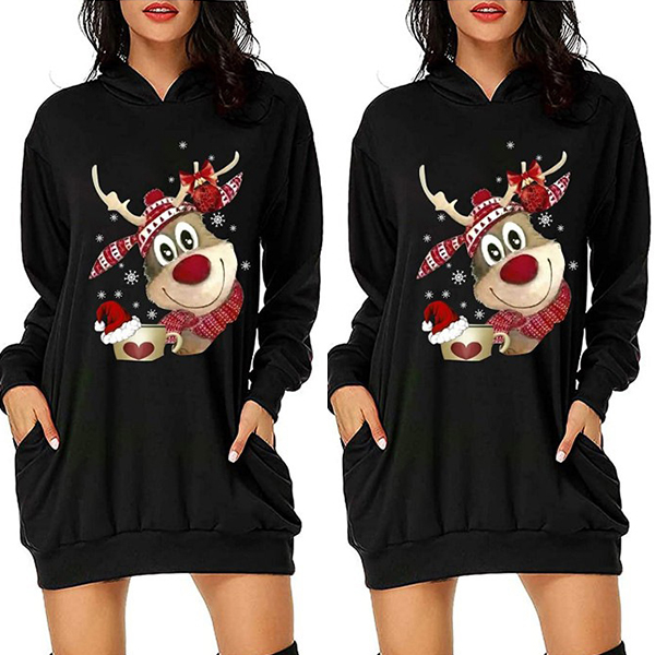 Worrying about what to wear on your Christmas Day? Then you can make your eyes focused on this sweatshirt dress. The reindeer pattern design makes it more matching with the festival atmosphere. Crafted from soft and breathable fabric,with long sleeve,hooded and a loose silhouette,this piece is sure to offer you a comfortable day.