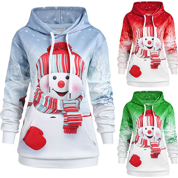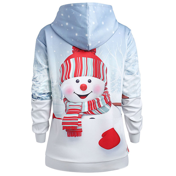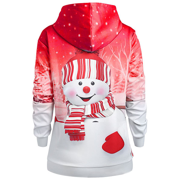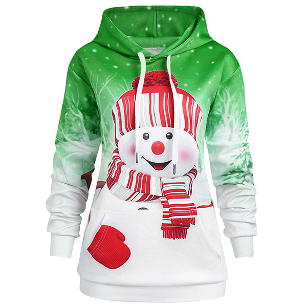 You can have an eye-catching look in this sweatshirt. The snowman printed pattern design makes it look so cute and playful,while the color gradient design will further enhance its charm. Finished with long sleeve and hooded silhouette,this wonderful piece is perfect fit for the coming Christmas Day!