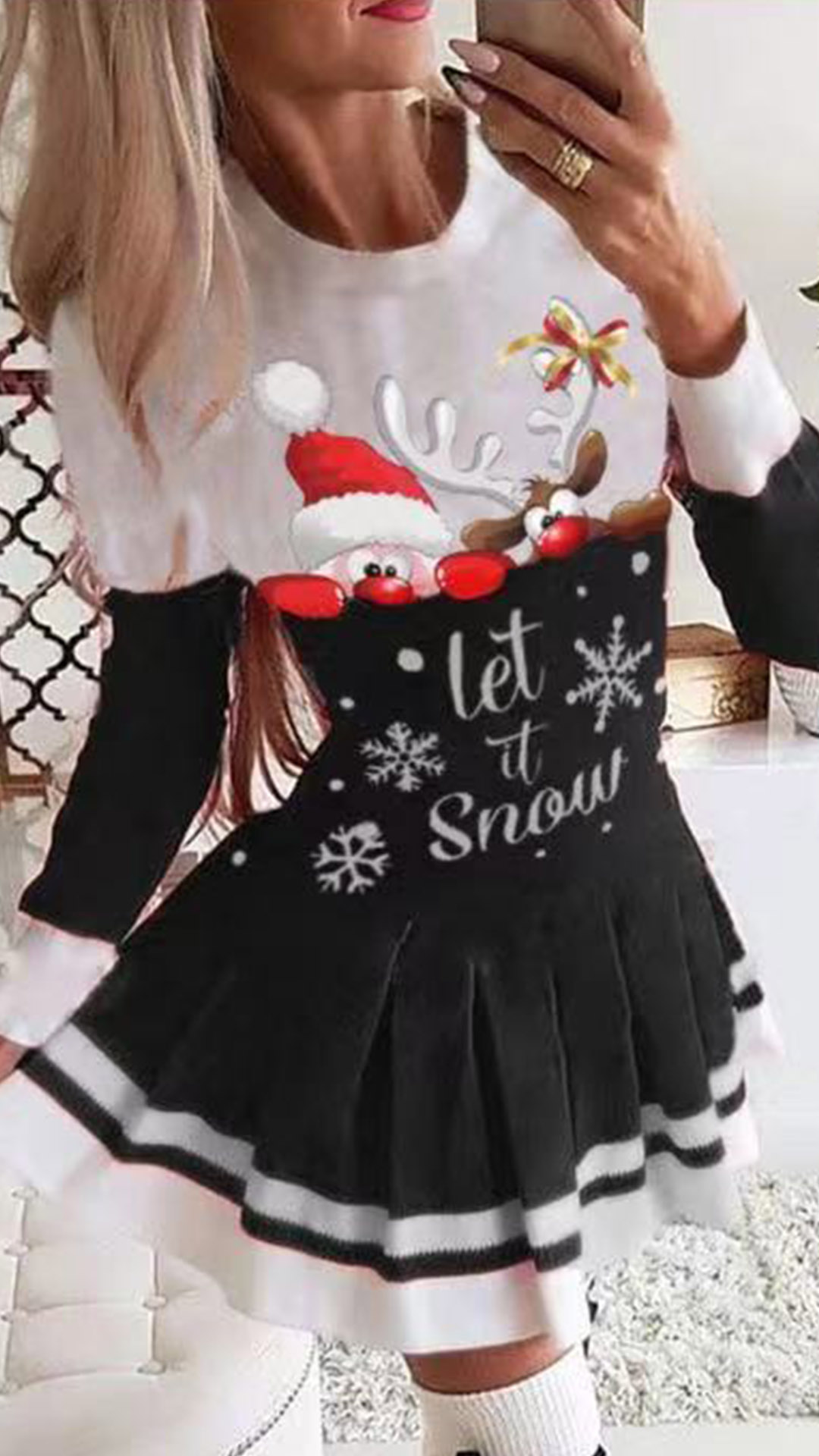Cute Style Christmas Printed Long Sleeve Round Neck Pleated Hem Dress