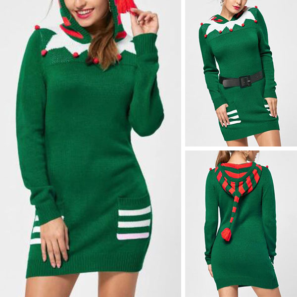 Don't know what to wear for the coming Christmas Day? Then look no further than this sweater dress. It comes with an eye-catching and bright green color tone,the striped spliced hooded with tail design makes it look so cute and playful. Just slip into this sweater dress to have a wonderful Christmas time.