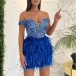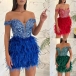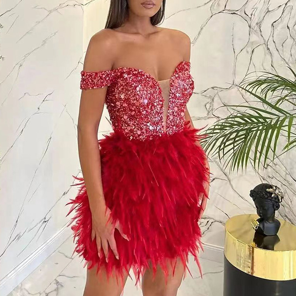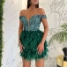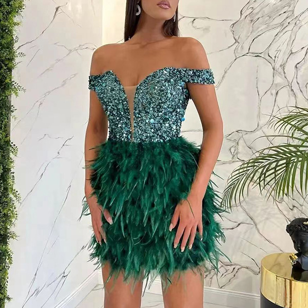 Dazzling One-Shoulder Evening Gown with Sequins and Feather Accents