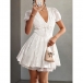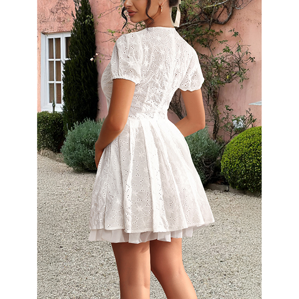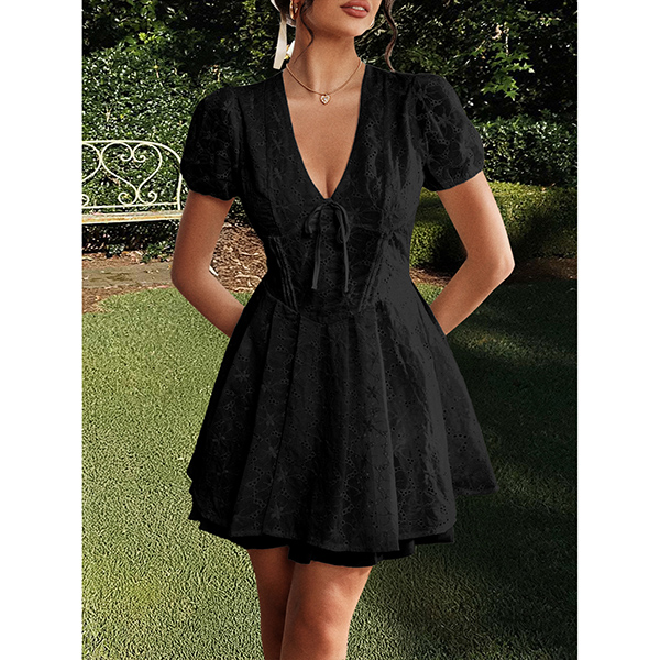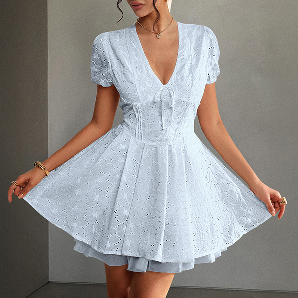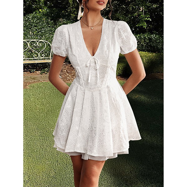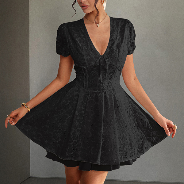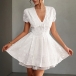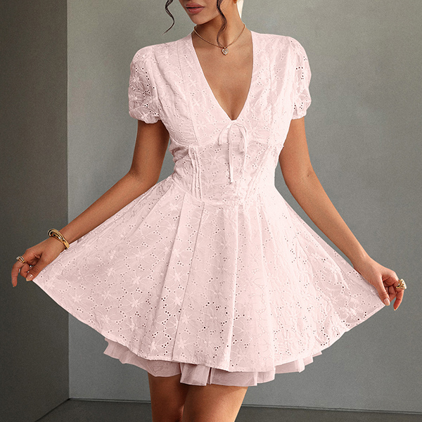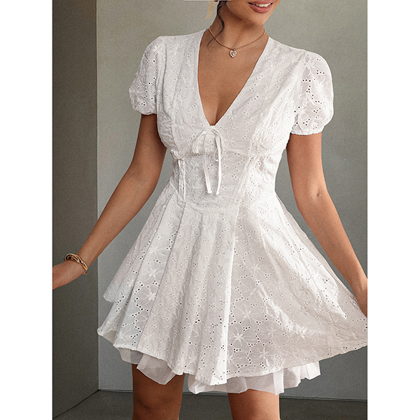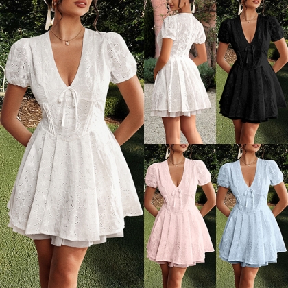 Fashion Solid Color V-neck Short Sleeve Lace Dress