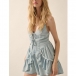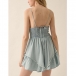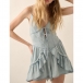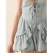Deep V-Neck Distressed Denim Jumpsuit with Suspenders and Ruffled Hem