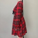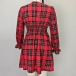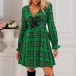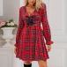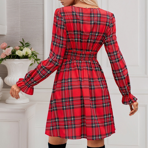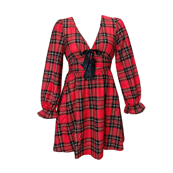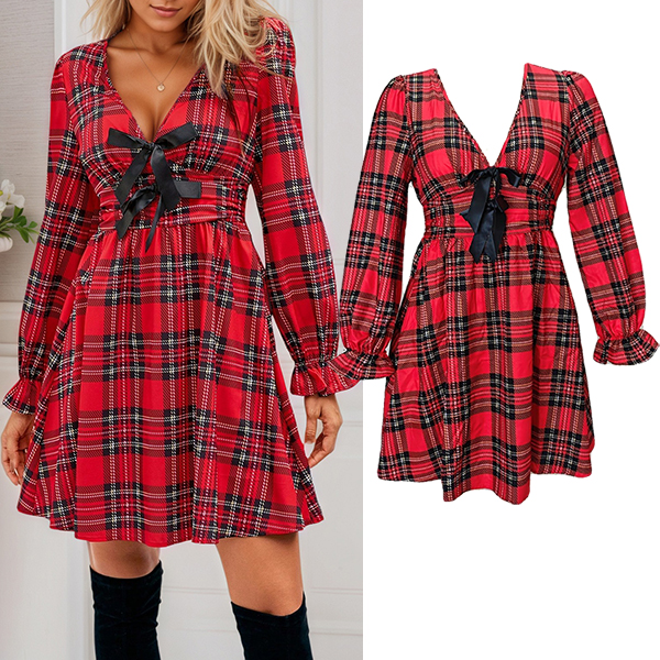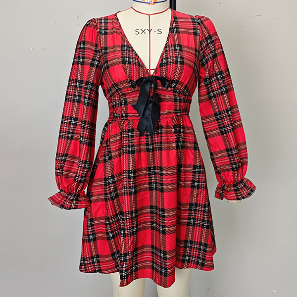 Deep V Neck Dress with Bowknot Waisted Design Lantern Sleeves in A-Line Plaid Style