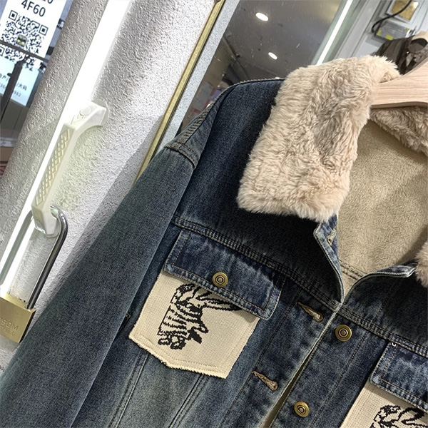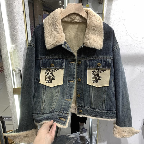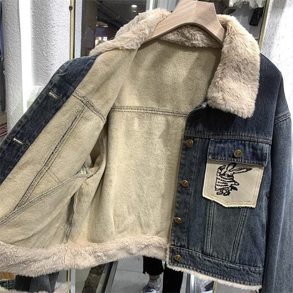 Denim Jacket with Large Fur Collar Stylish Fleece Outerwear