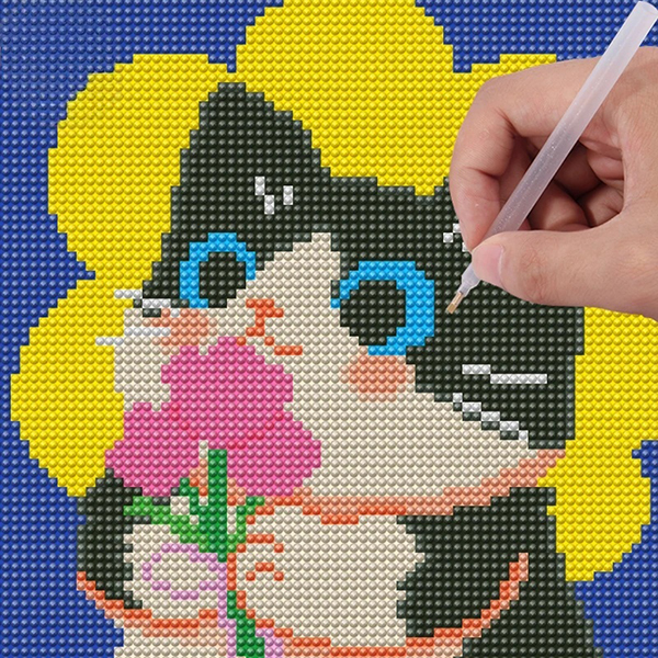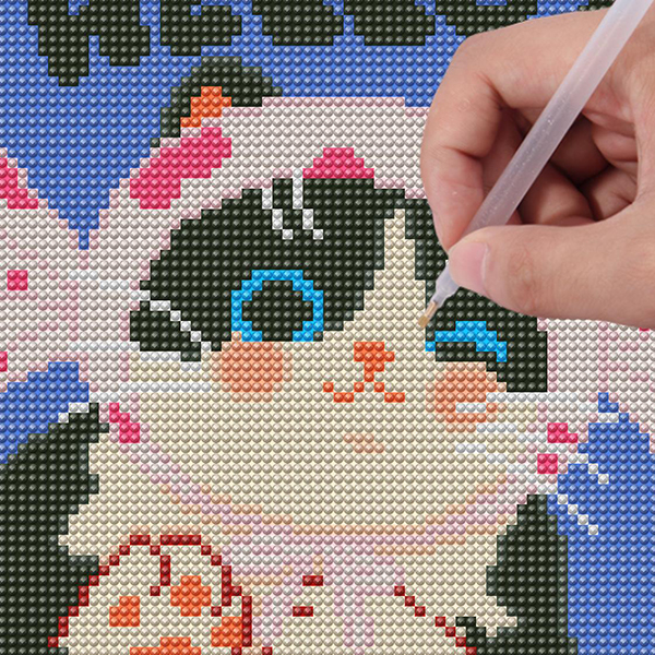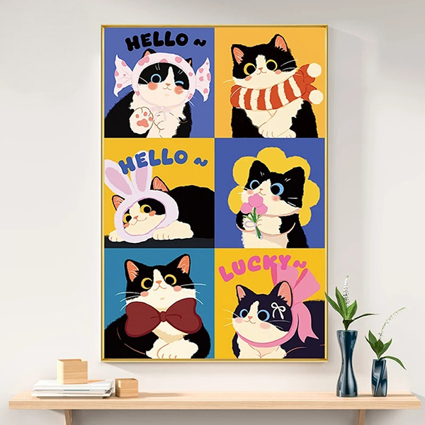 This "Diamond Painting-Hello Lucky Cat" features an adorable diamond painting showcasing a playful cat in various cute poses and accessories. Each panel highlights a different expression, from a cheerful "Hello" to a playful "Lucky," all set against vibrant backgrounds. This delightful artwork captures the whimsical charm of cats and adds a touch of joy and color to any space, making it perfect for cat lovers and art enthusiasts alike.