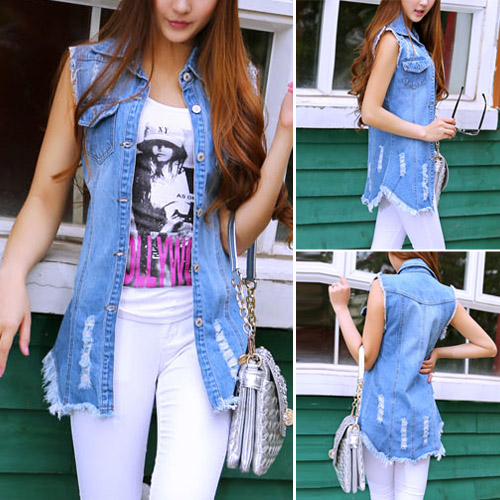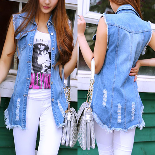 a basic collar,buttoned front,chest pockets and irregular hem design. Distressed style with ripped