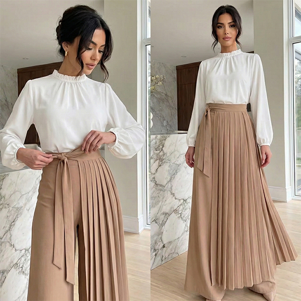 Elegant 2-in-1 Modest Palazzo Pants with Wrap-Around Pleated Apron