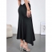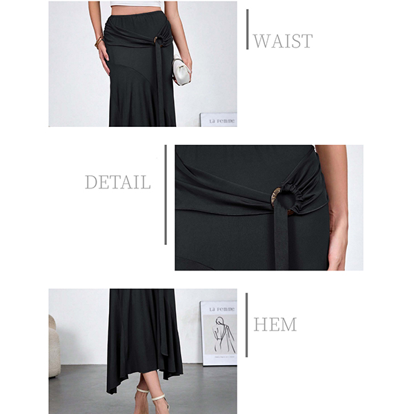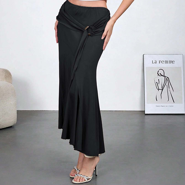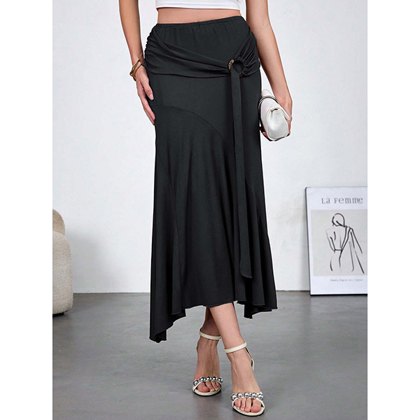 Elegant Black Ruched Drape Skirt - High Waist Asymmetrical Hem with Side Ring Accent