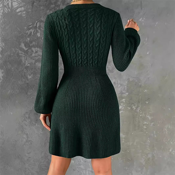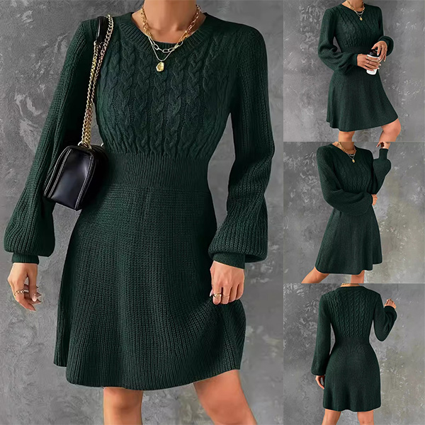 Elegant Cable Pattern Crew Neck Lantern Long Sleeve Sweater Dress