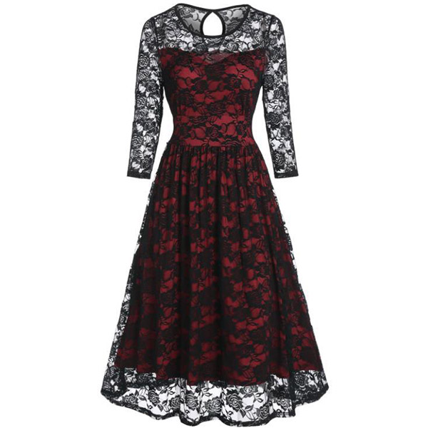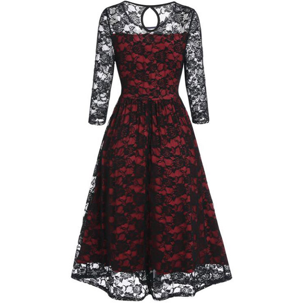 Elegant Contrast Color Crew Neck Long Sleeve Lace Dress