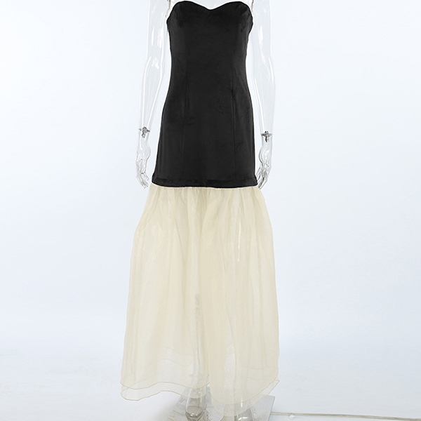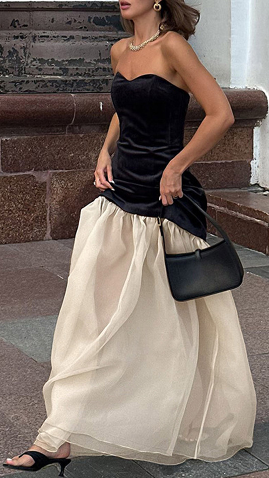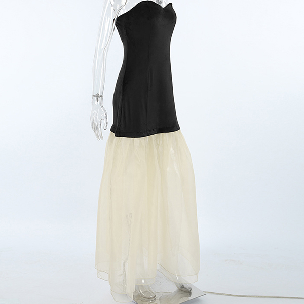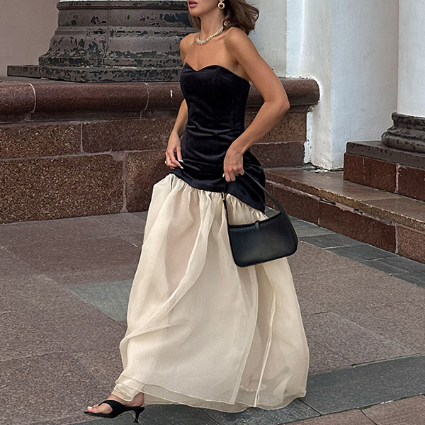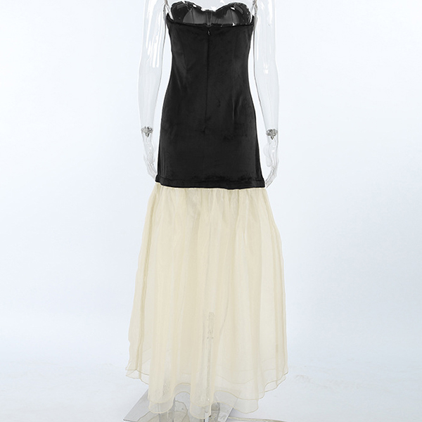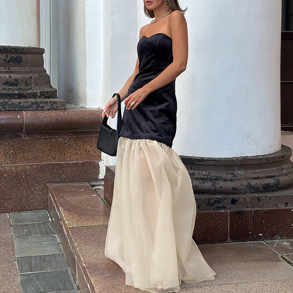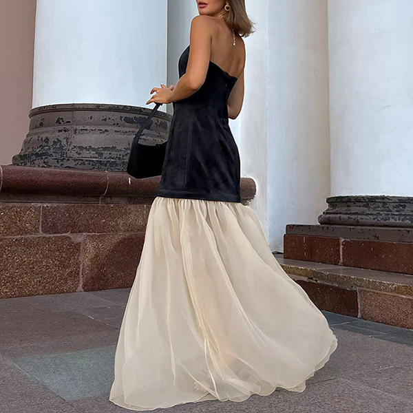 This party dress features contrasting colors, a strapless design, and a maxi length for a show-stopping look. This dress is perfect for special occasions, parties, and events where you want to make a statement and turn heads.