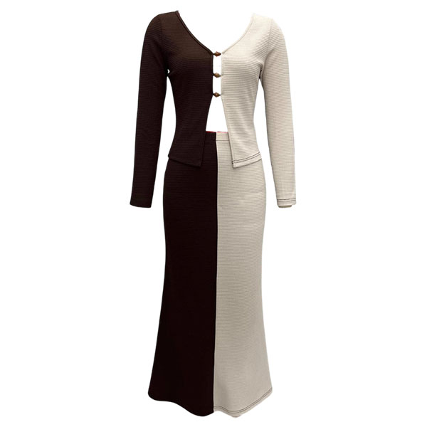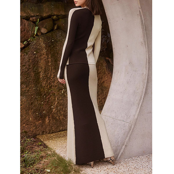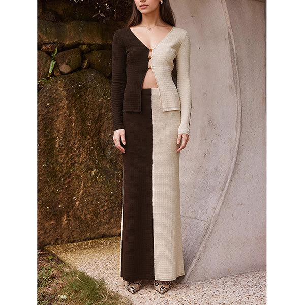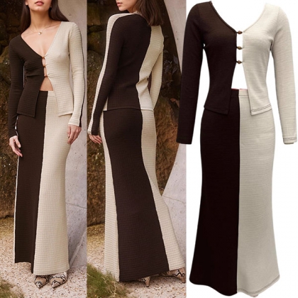 Elegant Contrast Color Two-piece Set Consist of Button Vest and Maxi Skirt