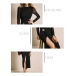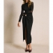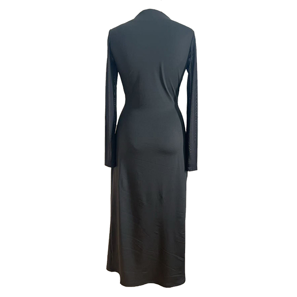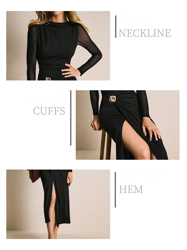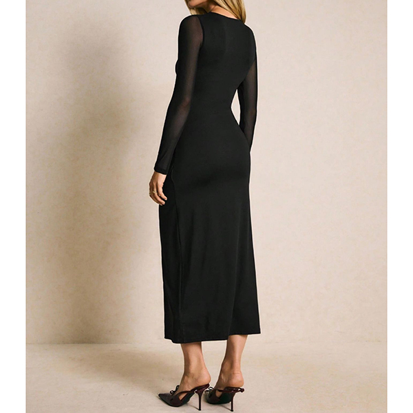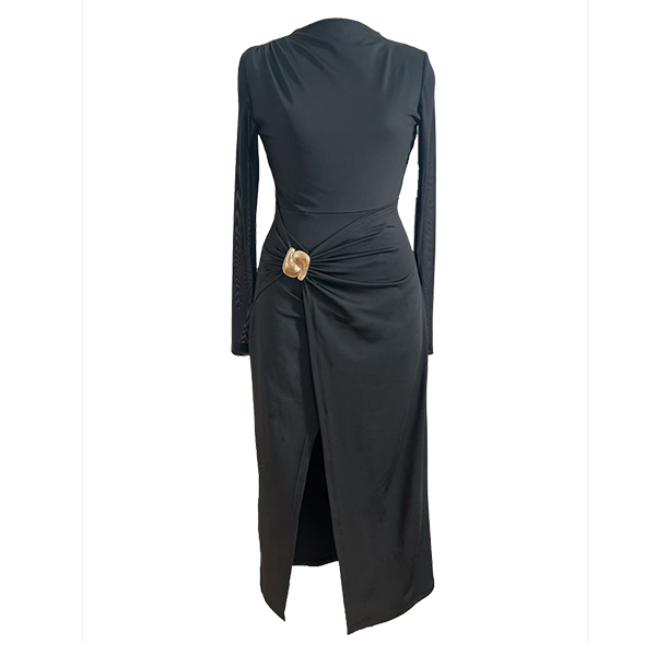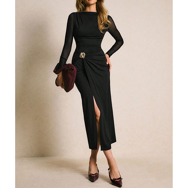 Elevate your evening wear with this Black Midi Dress. This stunning dress features a classic crew neckline and long sleeves, beautifully spliced with delicate gauze for a touch of sophistication. The side slit adds a flirty element, while the stylish metal button detailing introduces a modern flair. Pair it with heeled for a fashion chic look.